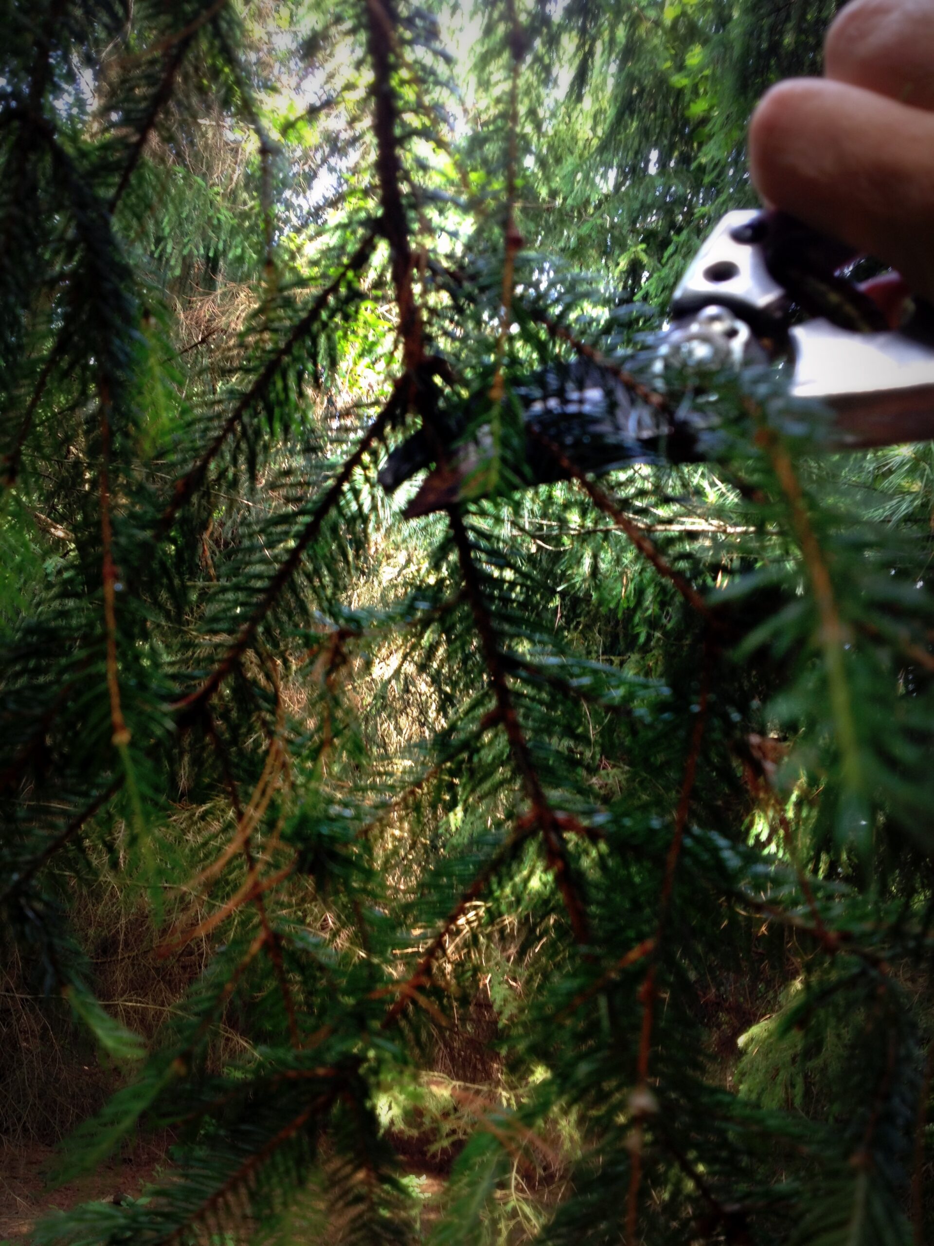 Some trees grow very slowly. Pine branches, for instance, may only grow an inch or so each year. In cases where it’s not necessary (or desirable) to remove a branch entirely you can trim years of growth by trimming at a branch juncture, like this: