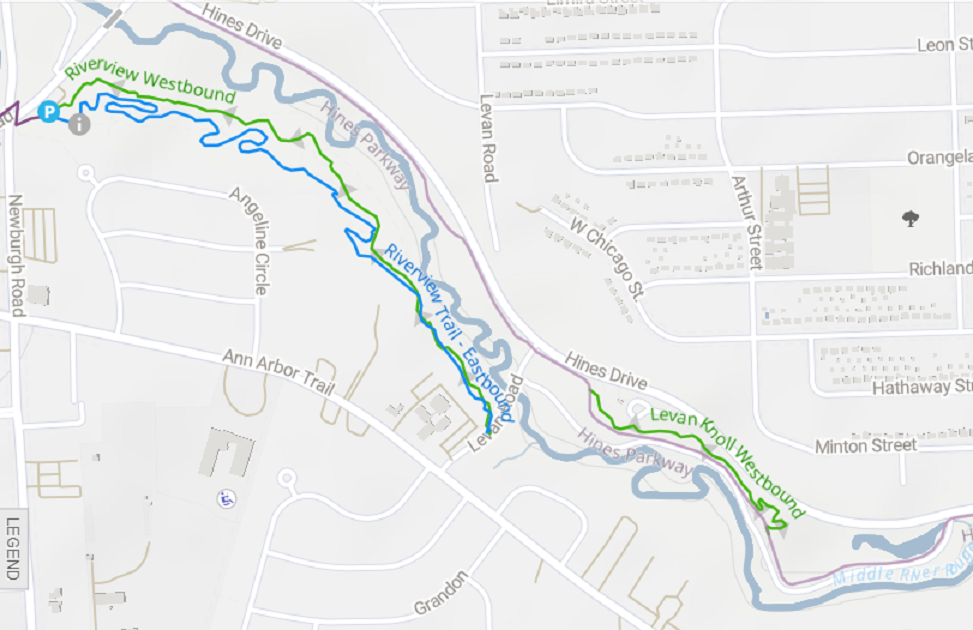 - The Riverview Trail is a 1.7 mile trail that continues east of Newburgh, providing more up close and personal encounters with the Rouge River mixed with meadows and hardwood forests.