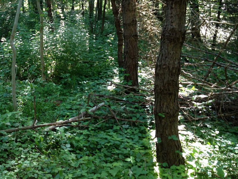 Really the only clues that identify this as an old trail are the cut branch stubs on the tree trunks next to where the trail once passed. There’s a lot of garlic mustard and other invasive plants that are all over this woods, but also a lot of small maples, beech (I think), and other desireables who will hopefully win out over time.